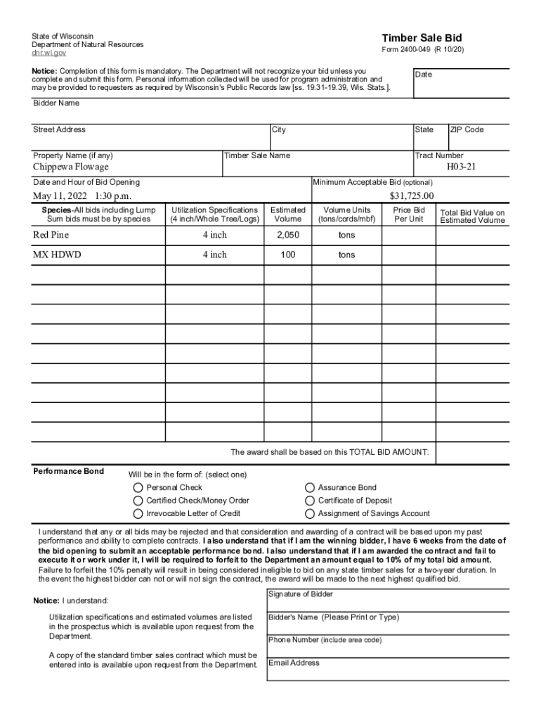 DNR.WI.conform 2400049 (R 10/20)Notice: Completion of this form is mandatory. The Department will not recognize your bid unless you