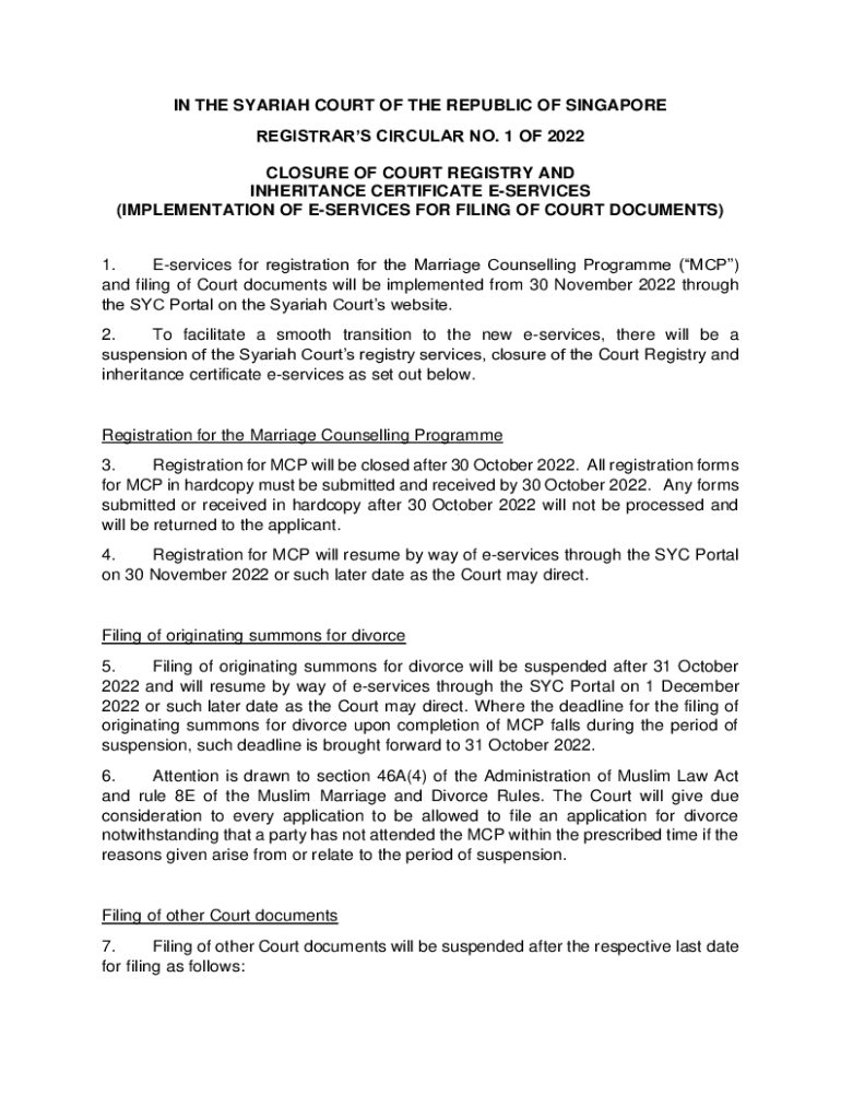 IN THE SHARIAH COURT OF THE REPUBLIC OF SINGAPORE REGISTRARS CIRCULAR NO. 1 OF 2022 CLOSURE OF COURT REGISTRY AND INHERITANCE CERTIFICATE SERVICES (IMPLEMENTATION OF SERVICES FOR FILING OF COURT DOCUMENTS)
