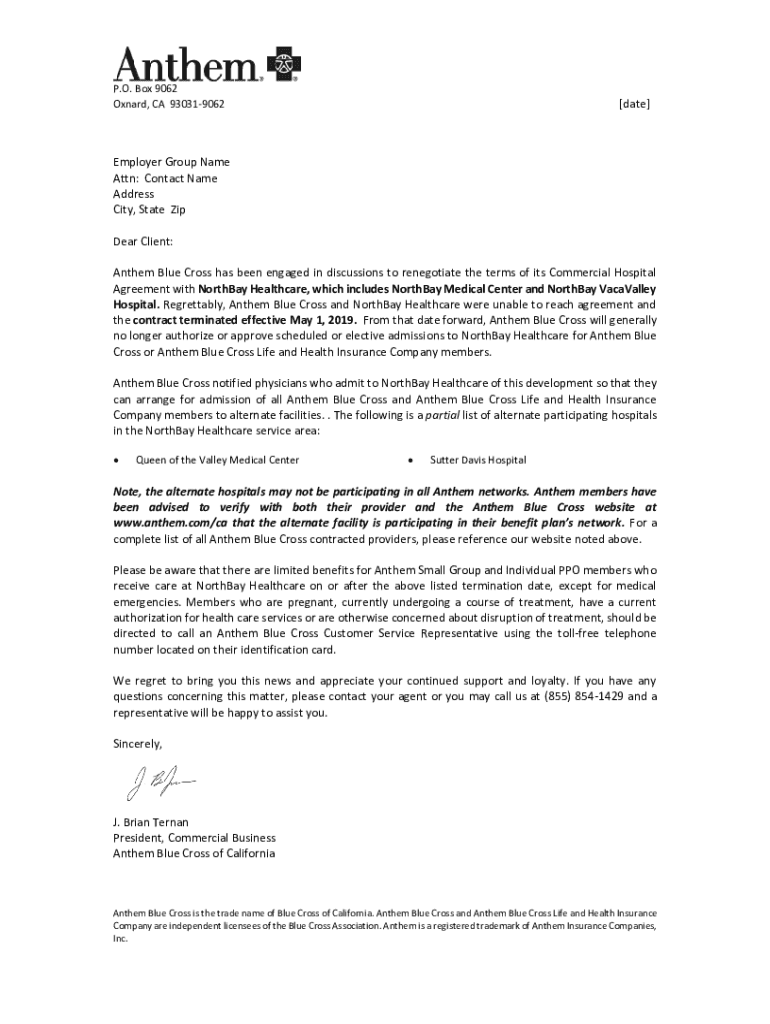 P.O. Box 9062 Oxnard, CA 930319062[date]Employer Group Name Attn: Contact Name Address City, State Zip Dear Client: Anthem Blue Cross has been engaged in discussions to renegotiate the terms of its