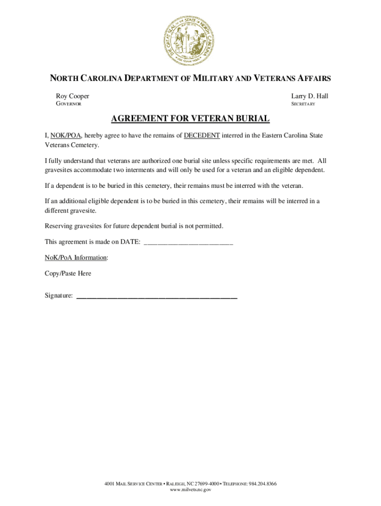 NORTH CAROLINA DEPARTMENT OF MILITARY AND VETERANS AFFAIRS Roy Cooper Larry D. HallGOVERNORSECRETARYAGREEMENT FOR VETERAN BURIAL I, NOK/POA, hereby agree to have the remains of DECEDENT interred in
