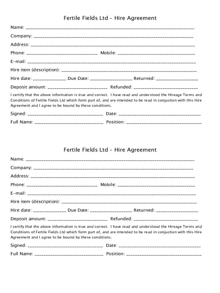 Fertile Fields Ltd Hire Agreement Name: ___ Company: ___ Address: ___ Phone: ___ Mobile: ___ Email: ___ Hire item (description): ___ Hire date: ___ Due Date: ___ Returned: ___ Deposit amount: ___