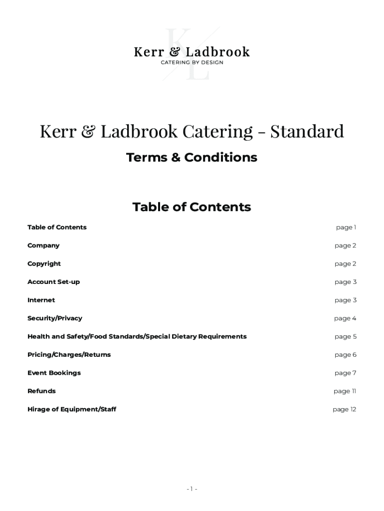 Kerr & Lad brook Catering Standard Terms & ConditionsTable of Contents Table of Contents page 1Companypage 2Copyrightpage 2Account Setup page 3Internetpage 3Security/Privacy page 4Health and Safety/Food
