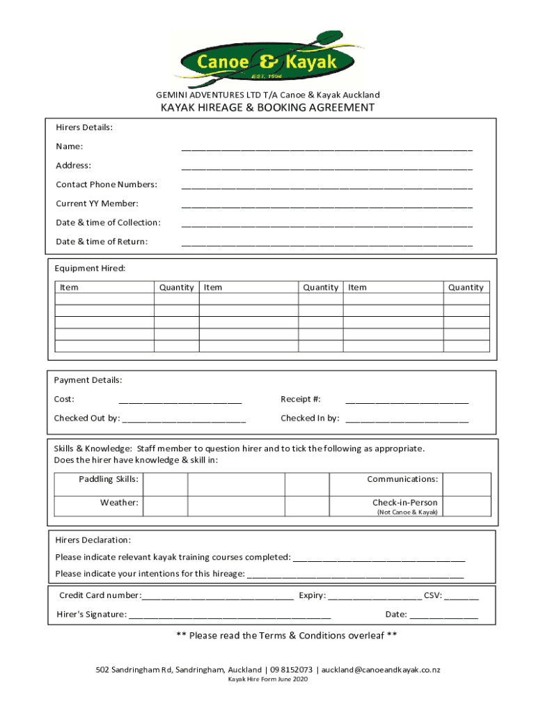 GEMINI ADVENTURES LTD T/A Canoe & Kayak AucklandKAYAK HIRE AGE & BOOKING AGREEMENTHirers Details: