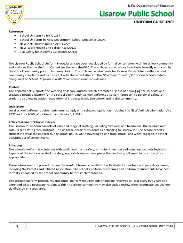 NSW Department of EducationUNIFORM GUIDELINES Reference School Uniform Policy (2018) School Uniforms in NSW Government School Guidelines (2004) NSW Antidiscrimination Act (1977) NSW Work Health and
