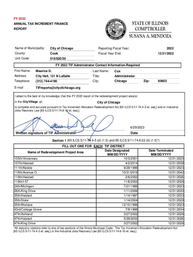 Reportage of Municipality:City of ChicagoCounty:Community Code:016/620/302022Reporting Fiscal Year:12/31/2022Fiscal Year End:FY 2022 TIF Administrator Contact