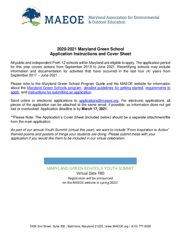 20202021 Maryland Green School Application Instructions and Cover Sheet All public and independent PreK12 schools within Maryland are eligible to apply. The application period for this year covers