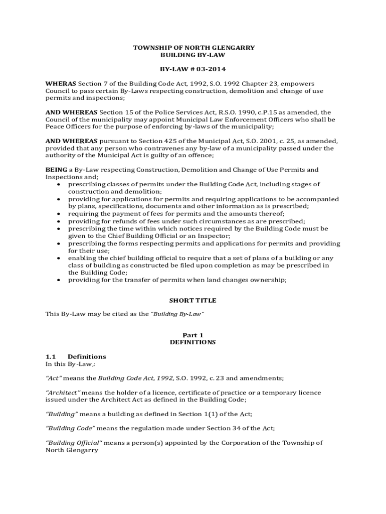 TOWNSHIP OF NORTH GLENGARRY BUILDING BYLAW # 032014 WHEREAS Section 7 of the Building Code Act, 1992, S.O. 1992 Chapter 23, empowers Council to pass certain Bylaws respecting construction, demolition