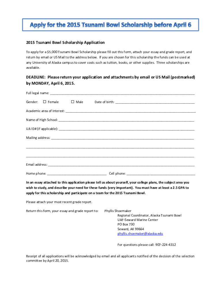 2015 Tsunami Bowl Scholarship Application To apply for a $5,000 Tsunami Bowl Scholarship please fill out this form, attach your essay and grade report, and return by email or US Mail to the address