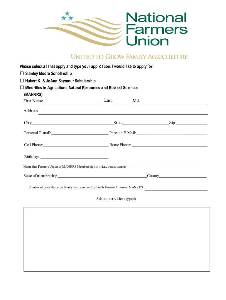 Dear Scholarship Applicant: Thank you for your interest in the National Farmers Union Foundation Stanley Moore and Hubert K., Joann Seymour Scholarships, and Minorities in Agriculture, Natural Resources