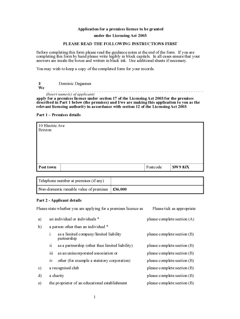 Application for a premises license to be granted under the Licensing Act 2003 PLEASE READ THE FOLLOWING INSTRUCTIONS FIRST Before completing this form please read the guidance notes at the end of