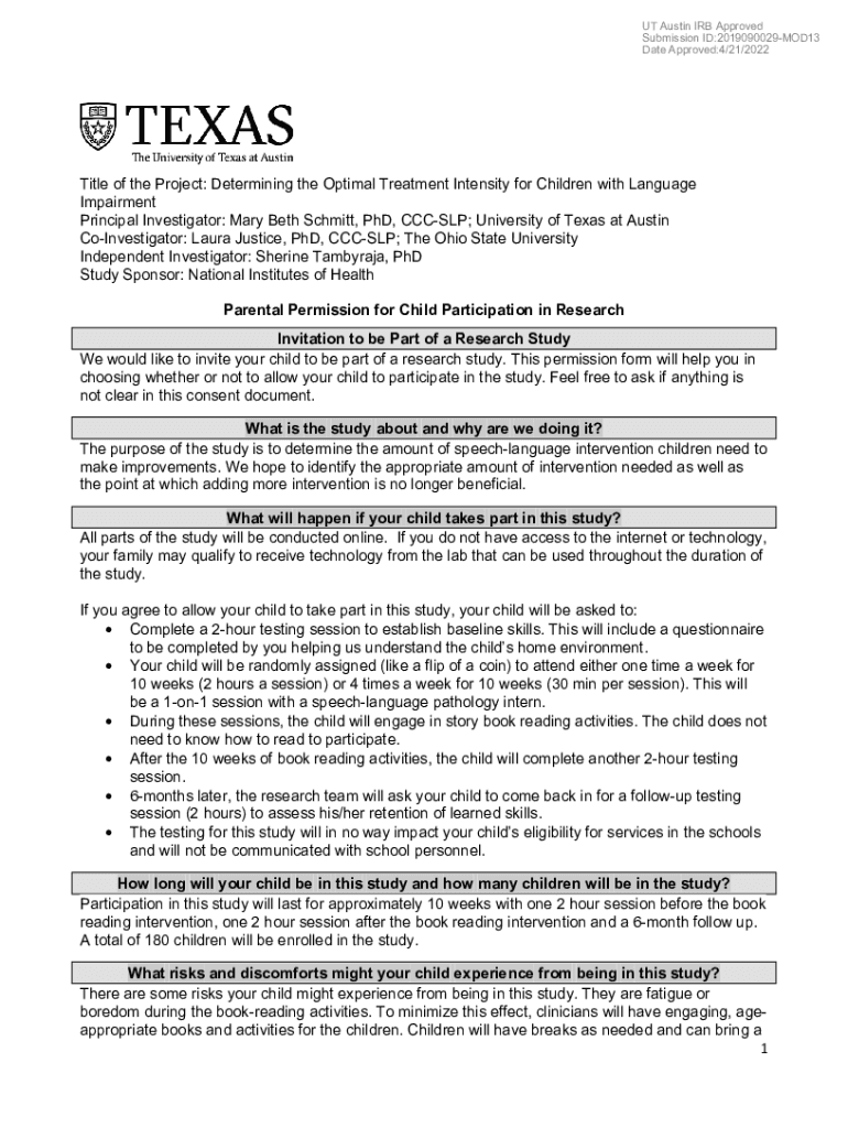 UT Austin IRB Approved Submission ID:2019090029MOD13 Date Approved:4/21/2022Title of the Project: Determining the Optimal Treatment Intensity for Children with Language Impairment Principal Investigator: