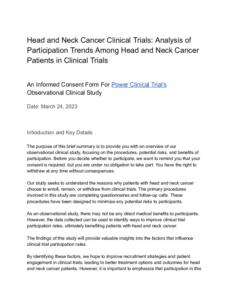 Head and Neck Cancer Clinical Trials: Analysis of Participation Trends Among Head and Neck Cancer Patients in Clinical Trials An Informed Consent Form For Power Clinical Trial\'s Observational Clinical