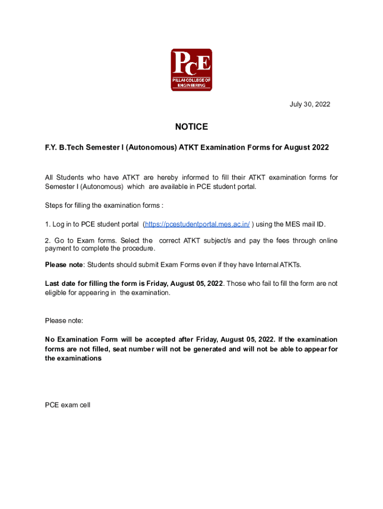 Get the free Notice for SEM I (Autonomous) ATKT examination forms ...