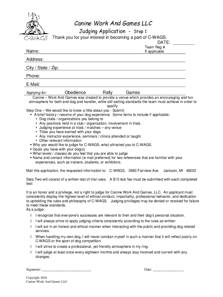 Canine Work And Games LLC Judging Application Step 1 Thank you for your interest in becoming a part of CRAGS. DATE: ___ Name:Team Reg # If applicableAddress: City / State / Zip: Phone: Email: Applying