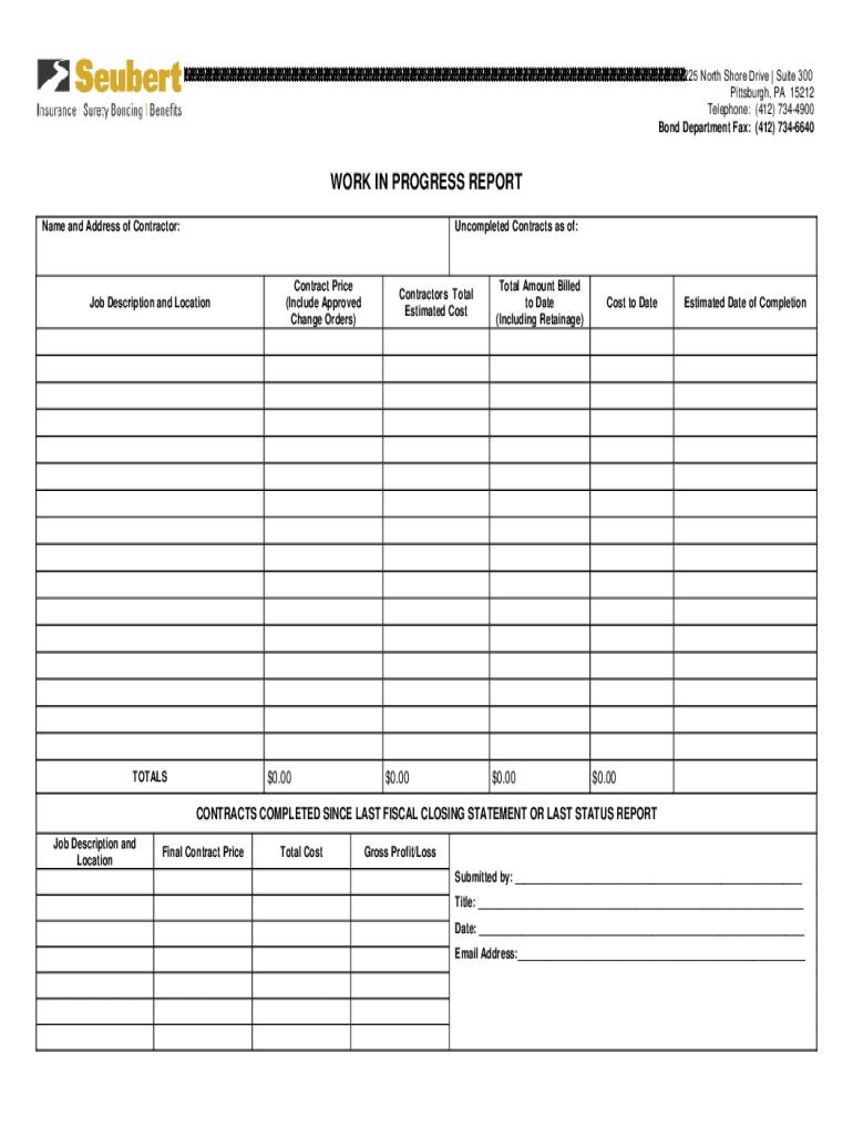 225 North Shore Drive | Suite 300 Pittsburgh, PA 15212 Telephone: (412) 7344900 Bond Department Fax: (412) 7346640WORK IN PROGRESS REPORT Name and Address of Contractor:Uncompleted Contracts as of:Job