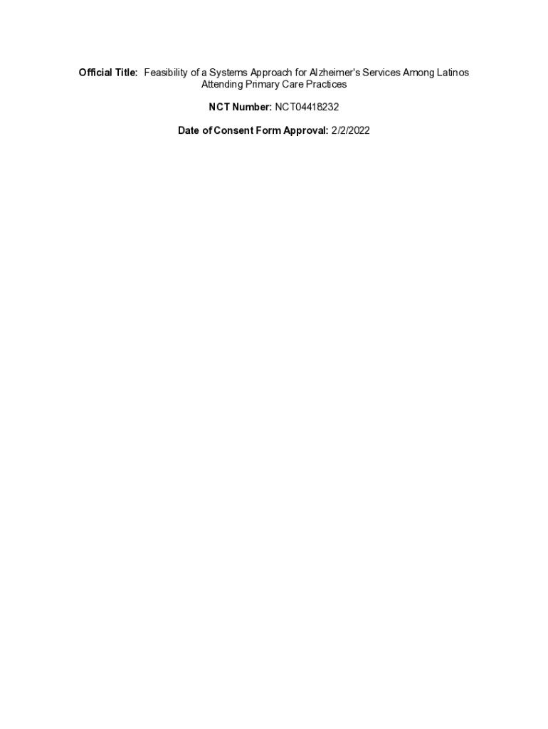 Official Title: Feasibility of a Systems Approach for Alzheimer\'s Services Among Latinos Attending Primary Care Practices NCT Number: NCT04418232 Date of Consent Form Approval: 2/2/2022RESEARCH CONSENT