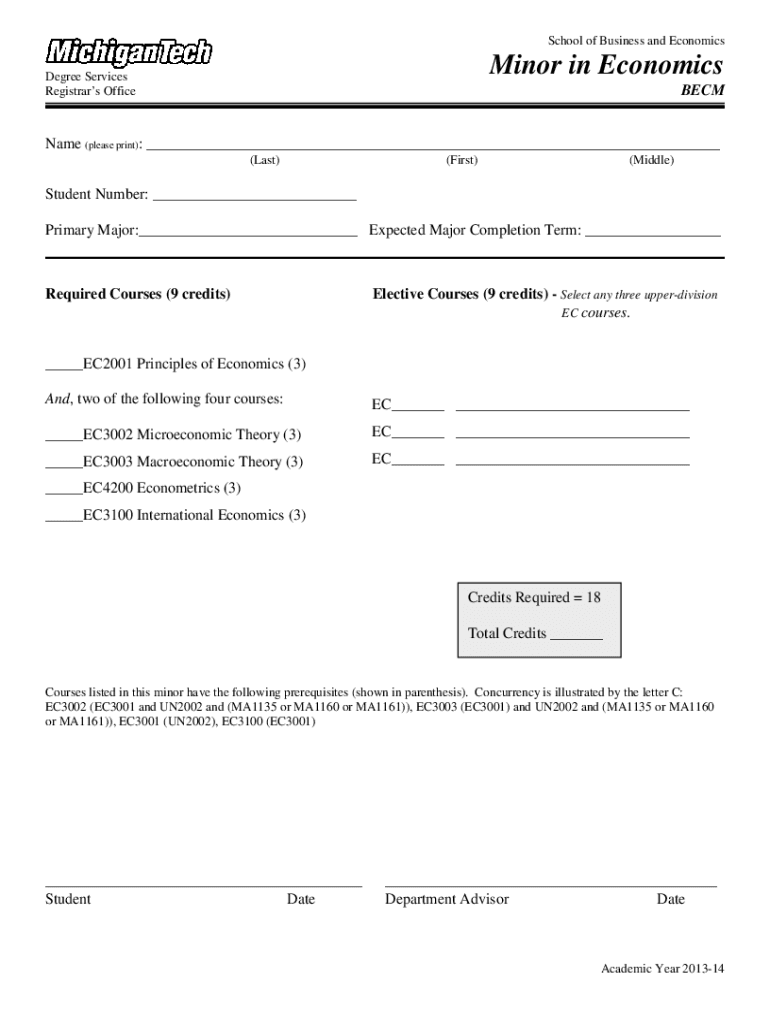 School of Business and EconomicsMinor in EconomicsDegree Services Registrars OfficeBECMName (please print): ___ (Last)(First)(Middle)Student Number: ___ Primary Major:___ Expected Major Completion