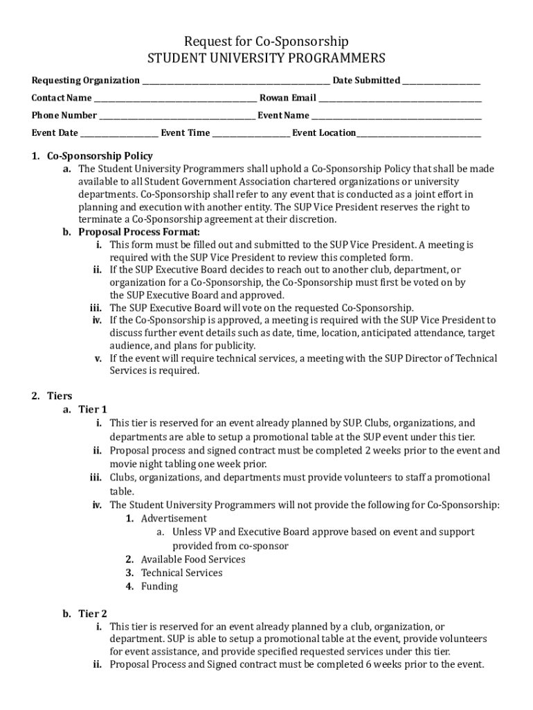 Request for Cosponsor ship STUDENT UNIVERSITY PROGRAMMERS Requesting Organization ___ Date Submitted ___ Contact Name ___ Rowan Email ___ Phone Number ___ Event Name ___ Event Date ___ Event Time