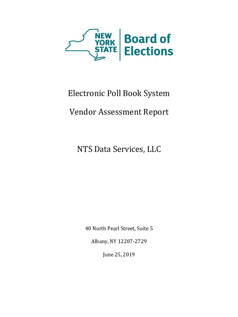 Electronic Poll Book System Vendor Assessment Report NTS Data Services, LLC40 North Pearl Street, Suite 5 Albany, NY 122072729 June 25, 2019Version History 06.25.19 Original Versions Evaluation Vendor