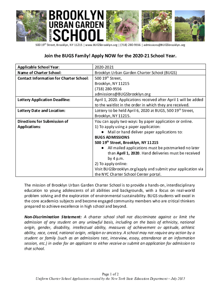 500 19th Street, Brooklyn, NY 11215 | www.BUGSbrooklyn.org | (718) 2809556 | admissions@BUGSbrooklyn.orgJoin the BUGS Family! Apply NOW for the 202021 School Year. Applicable School Year: Name of