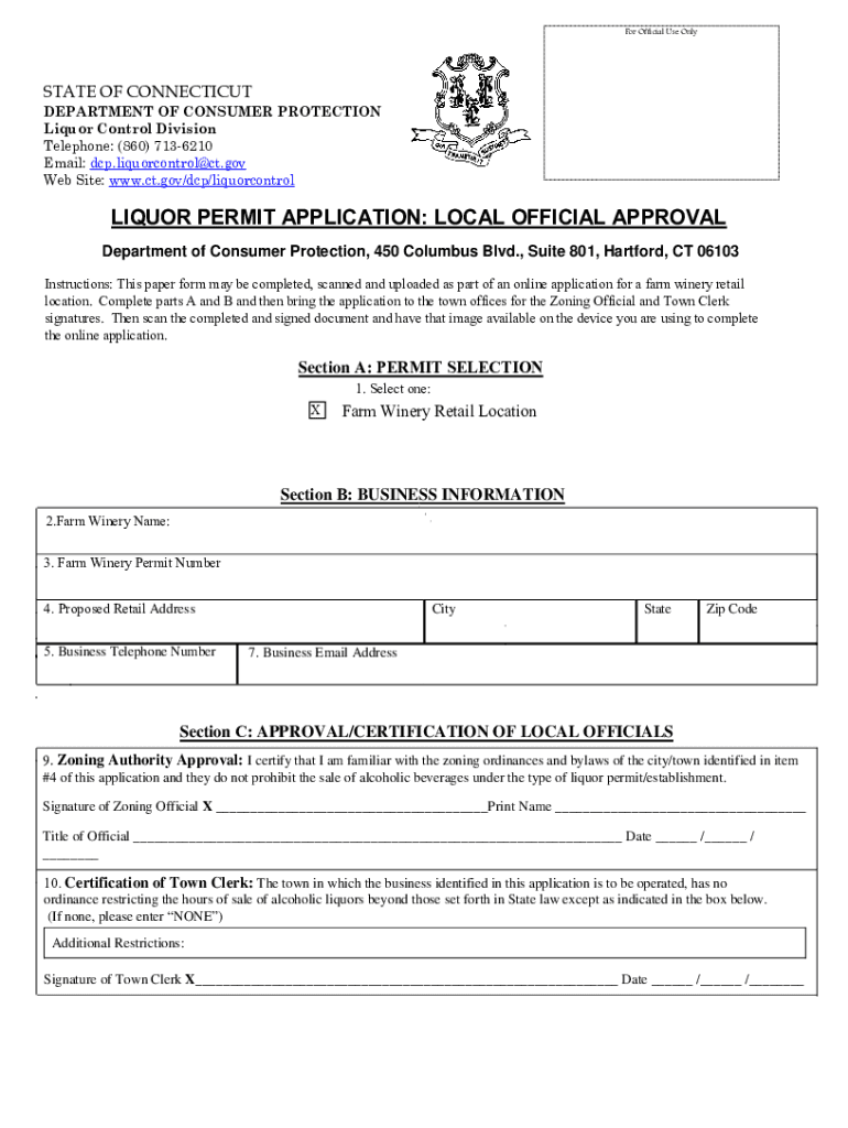 For Official Use Onstage OF CONNECTICUTDEPARTMENT OF CONSUMER PROTECTION Liquor Control Division Telephone: (860) 7136210 Email: dcp.liquorcontrol@ct.gov Website: www.ct.gov/dcp/liquorcontrolLIQUOR