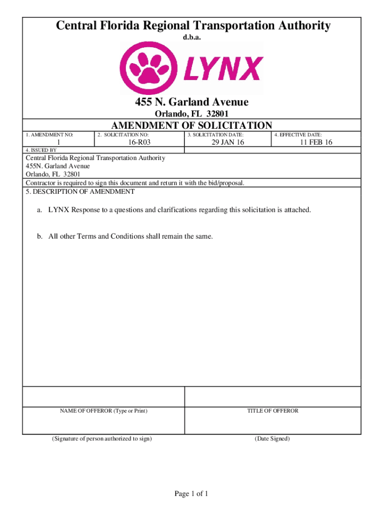 Central Florida Regional Transportation Authority d.b.a.455 N. Garland Avenue Orlando, FL 32801AMENDMENT OF SOLICITATION 1. AMENDMENT NO:12. SOLICITATION NO:3. SOLICITATION DATE:16R034. EFFECTIVE