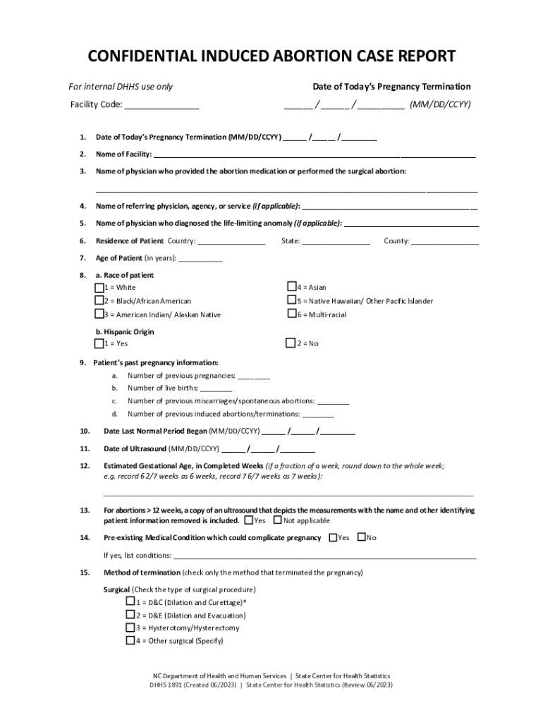 CONFIDENTIAL INDUCED ABORTION CASE REPORT For internal HHS use only Facility Code: ___Date of Today's Pregnancy Termination ___ / ___ / ___ (MM/DD/CITY)1. Date of Today's Pregnancy Termination (MM/DD/CITY)