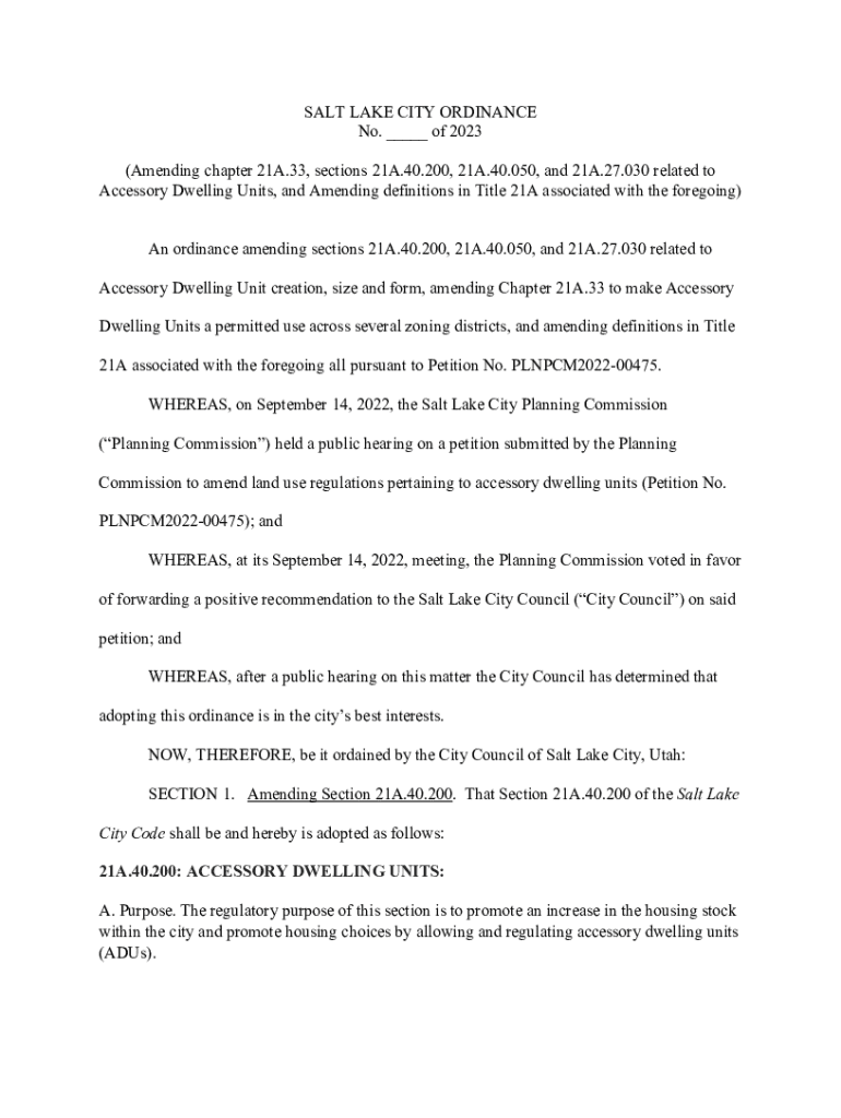 SALT LAKE CITY ORDINANCE No. ___ of 2023 (Amending chapter 21A.33, sections 21A.40.200, 21A.40.050, and 21A.27.030 related to Accessory Dwelling Units, and Amending definitions in Title 21A associated