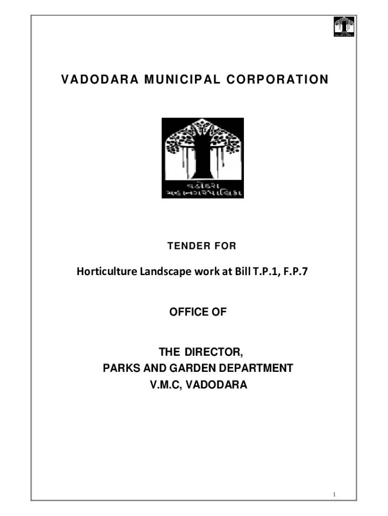 V A D O D A R A M U N I C I P A L C O R PO R A TI ON TENDER Horticulture Landscape work at Bill T.P.1, F.P.7 OFFICE THE DIRECTOR, PARKS AND GARDEN DEPARTMENT V.M.C, VADODARA1PREQUALIFICATIONBIDNAME