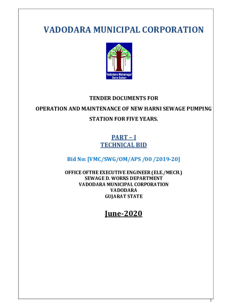 VADODARA MUNICIPAL CORPORATIONTENDER DOCUMENTS FOR OPERATION AND MAINTENANCE OF NEW HAND SEWAGE PUMPING STATION FOR FIVE YEARS.PART I TECHNICAL BID No: [VMC/SG/OM/APS /00 /201920] OFFICE THE EXECUTIVE