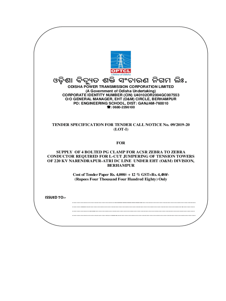 ODISHA POWER TRANSMISSION CORPORATION LIMITED (A Government of Odisha Undertaking) CORPORATE IDENTITY NUMBER (IN) U40102OR2004GC007553 O/O GENERAL MANAGER, EAT (O&M) CIRCLE, BERHAMPUR PO: ENGINEERING