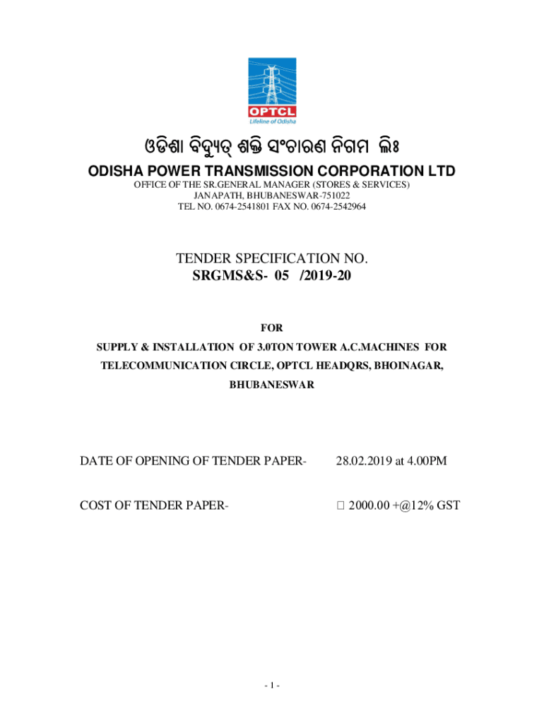 ODISHA POWER TRANSMISSION CORPORATION LTD OFFICE OF THE SR.GENERAL MANAGER (STORES & SERVICES) NAMATH, BHUBANESWAR751022 TEL NO. 06742541801 FAX NO. 06742542964TENDER SPECIFICATION NO. RAMSES 05 /201920FOR