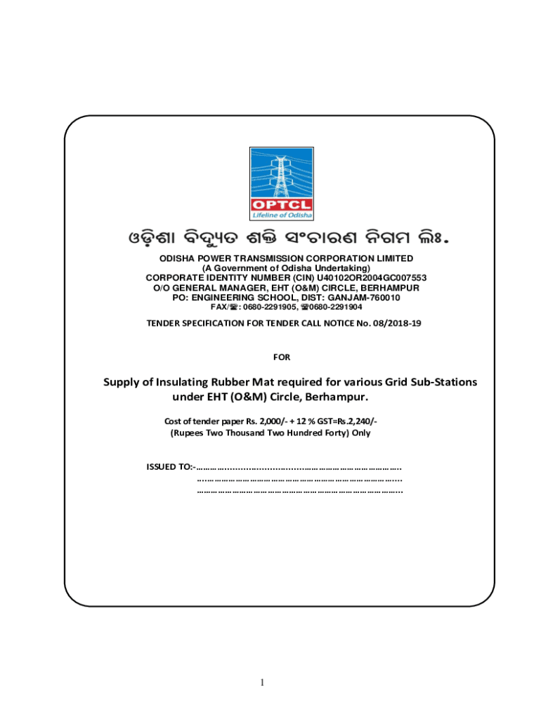 ODISHA POWER TRANSMISSION CORPORATION LIMITED (A Government of Odisha Undertaking) CORPORATE IDENTITY NUMBER (IN) U40102OR2004GC007553 O/O GENERAL MANAGER, EAT (O&M) CIRCLE, BERHAMPUR PO: ENGINEERING