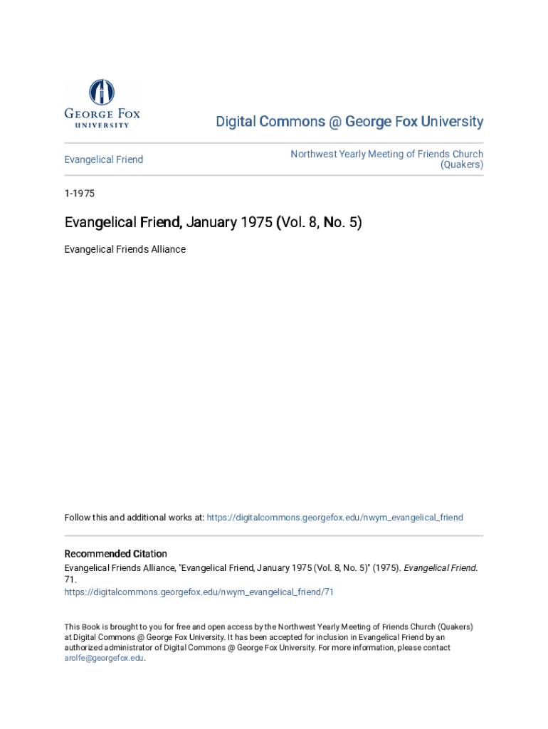 Digital Commons @ George Fox University Evangelical Friend Northwest Yearly Meeting of Friends Church (Quakers)11975Evangelical Friend, January 1975 (Vol. 8, No. 5) Evangelical Friends AllianceFollow