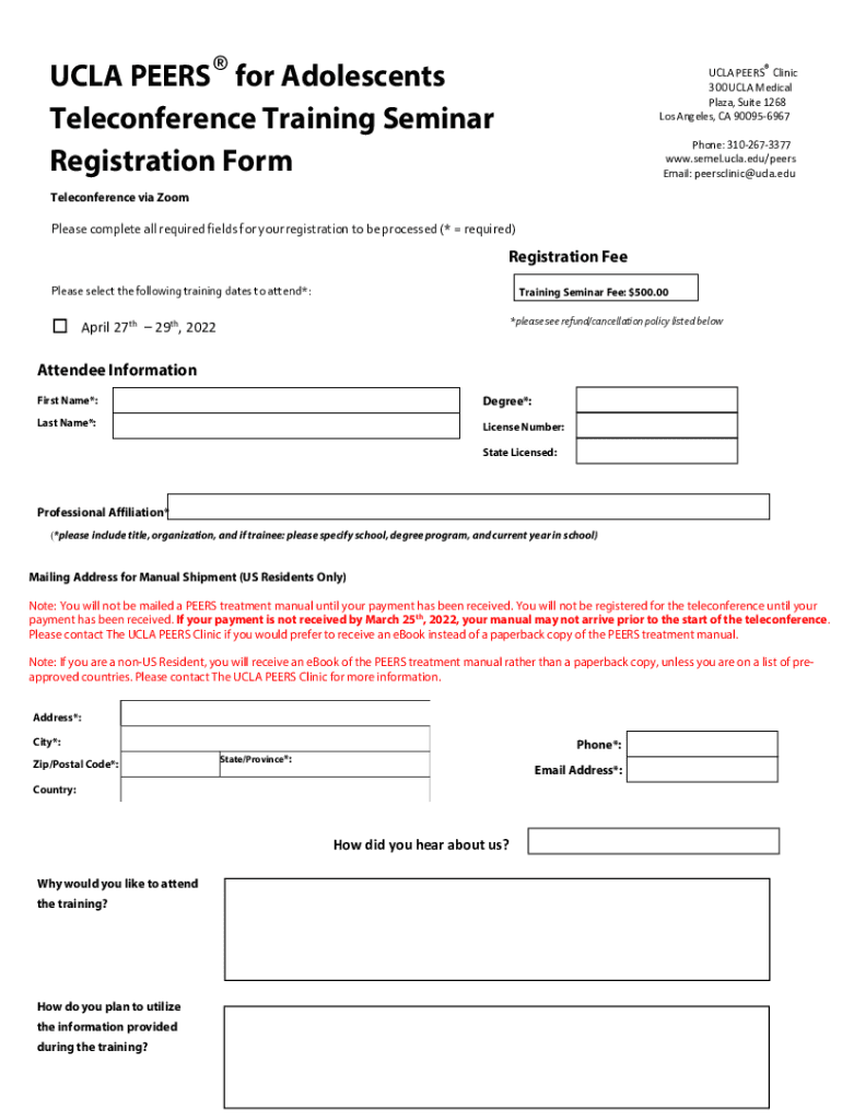 UCLA PEERS for Adolescents Teleconference Training Seminar Registration Formula PEERS Clinic 300 UCLA Medical Plaza, Suite 1268 Los Angeles, CA 900956967 Phone: 3102673377 www.semel.ucla.edu/peers