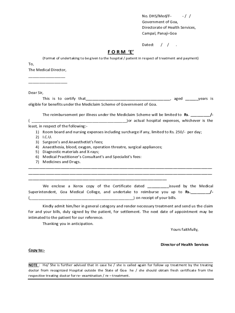 No. DHS/Med/F/ / Government of Goa, Directorate of Health Services, Carpal, Panjiva Dated://. F O R M E (Format of undertaking to be given to the hospital / patient in respect of treatment and payment)To,
