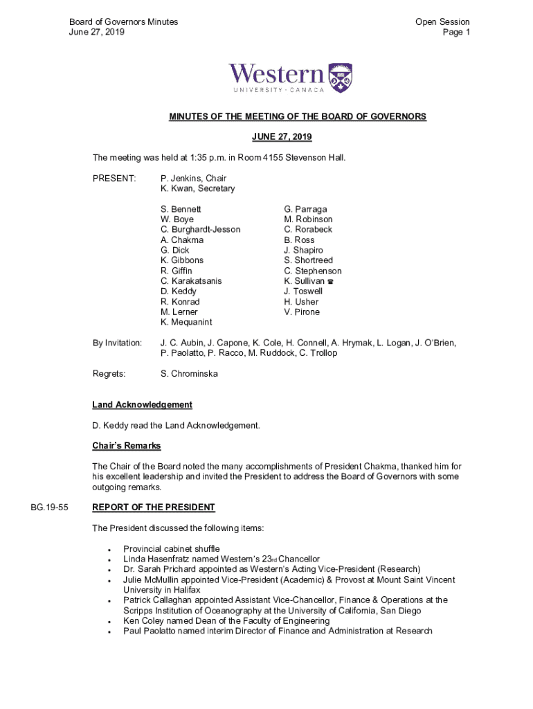 Board of Governors Minutes June 27, 2019Open Session Page 1MINUTES OF THE MEETING OF THE BOARD OF GOVERNORS JUNE 27, 2019, The meeting was held at 1:35 p.m. in Room 4155 Stevenson Hall. PRESENT:P.