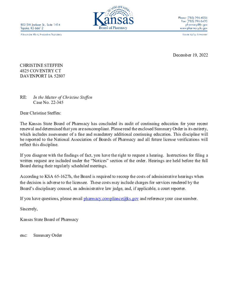 December 19, 2022, CHRISTINE STEFFEN 4825 COVENTRY CT DAVENPORT IA 52807RE:In the Matter of Christine Steffen Case No. 22345Dear Christine Steffen: The Kansas State Board of Pharmacy has concluded