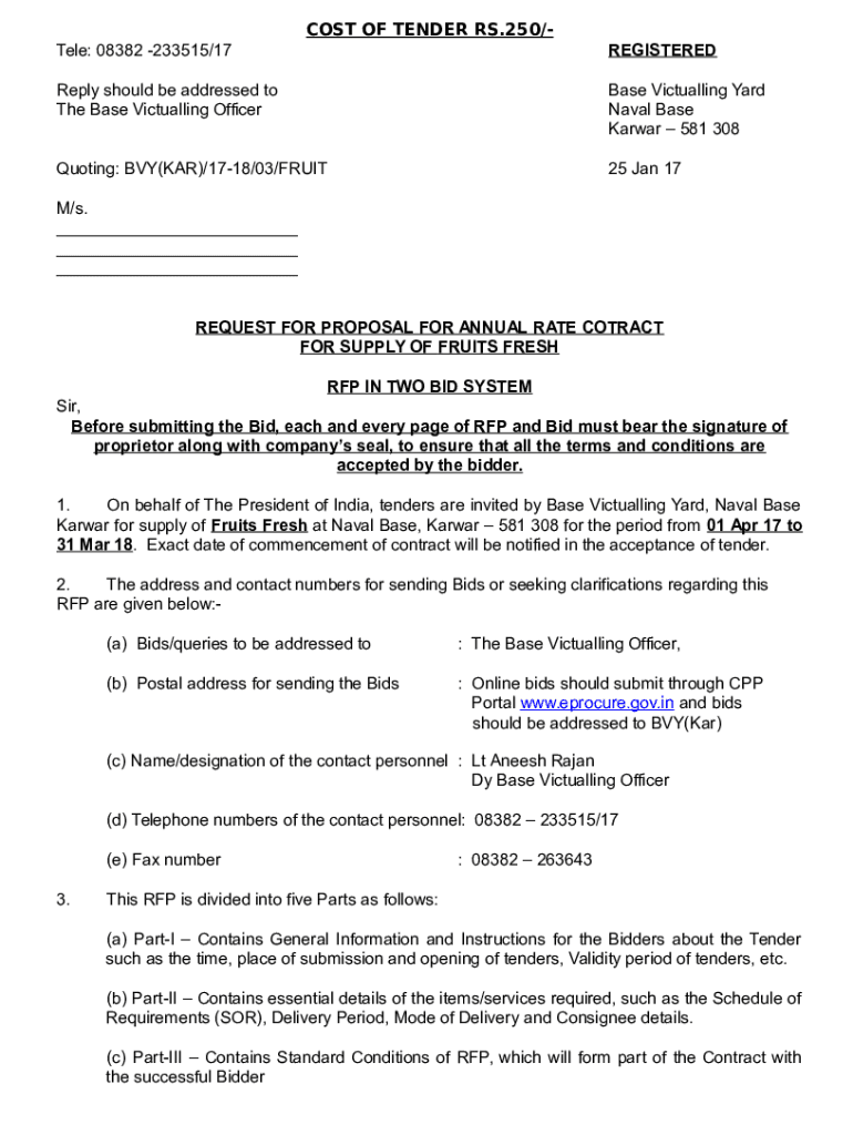 COST OF TENDER RS.250/Tele: 08382 233515/17REGISTEREDReply should be addressed to The Base Victualling Officers Victualling Yard Naval Base Karma 581 308Quoting: BVY(CAR)/1718/03/FRUIT25 Jan 17M/s.