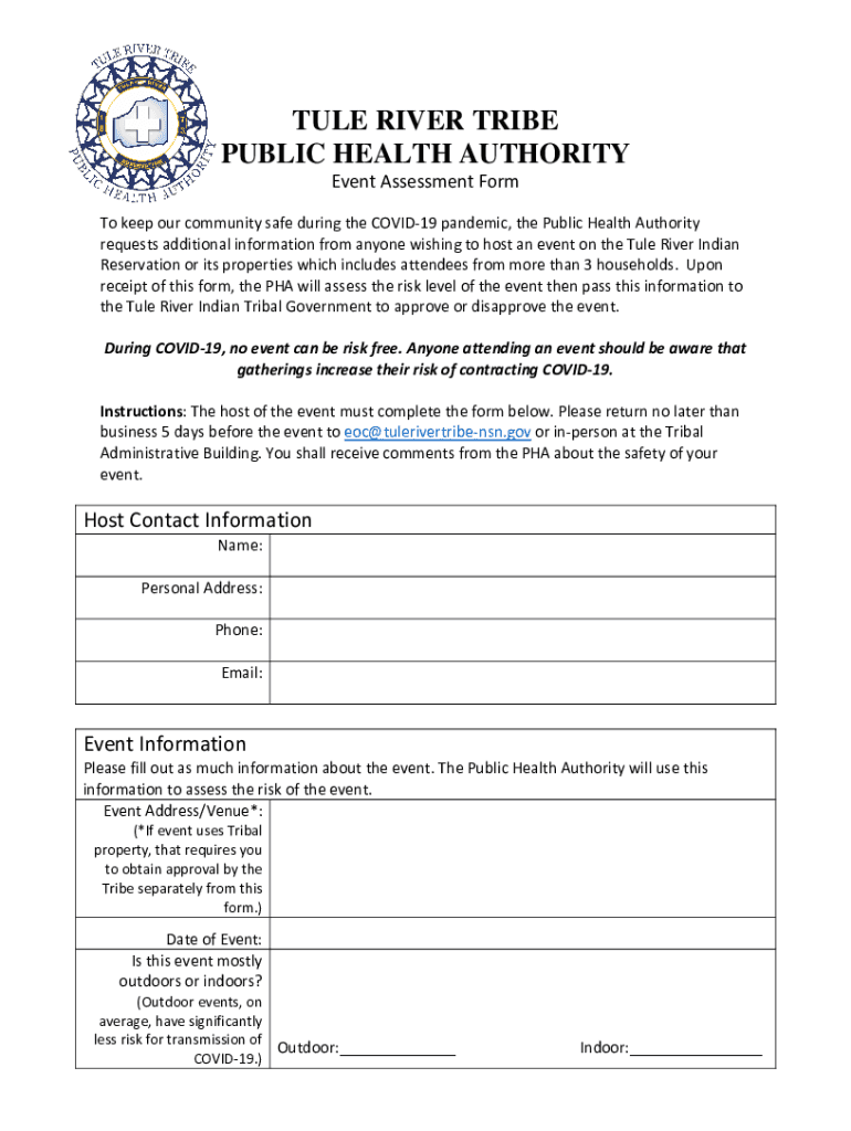 RULE RIVER TRIBE PUBLIC HEALTH AUTHORITY Event Assessment Form keep our community safe during the COVID-19 pandemic, the Public Health Authority requests additional information from anyone wishing