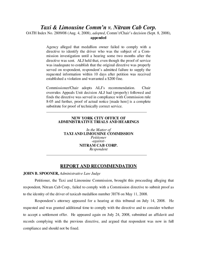 Taxi & Limousine Common v. Ni tram Cab Corp. OATH Index No. 2809/08 (Aug. 4, 2008), adopted, Comma/Chairs decision (Sept. 8, 2008), appended Agency alleged that medallion owner failed to comply with