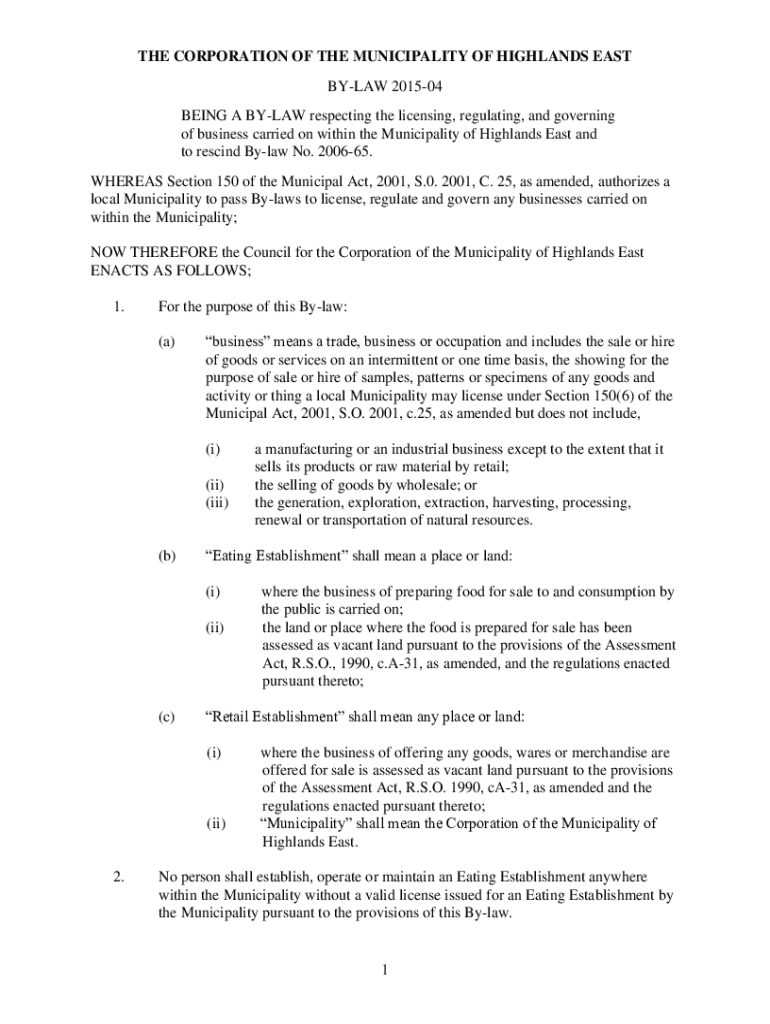 THE CORPORATION OF THE MUNICIPALITY OF HIGHLANDS EAST BYLAW 201504 BEING A BYLAW respecting the licensing, regulating, and governing of business carried on within the Municipality of Highlands East