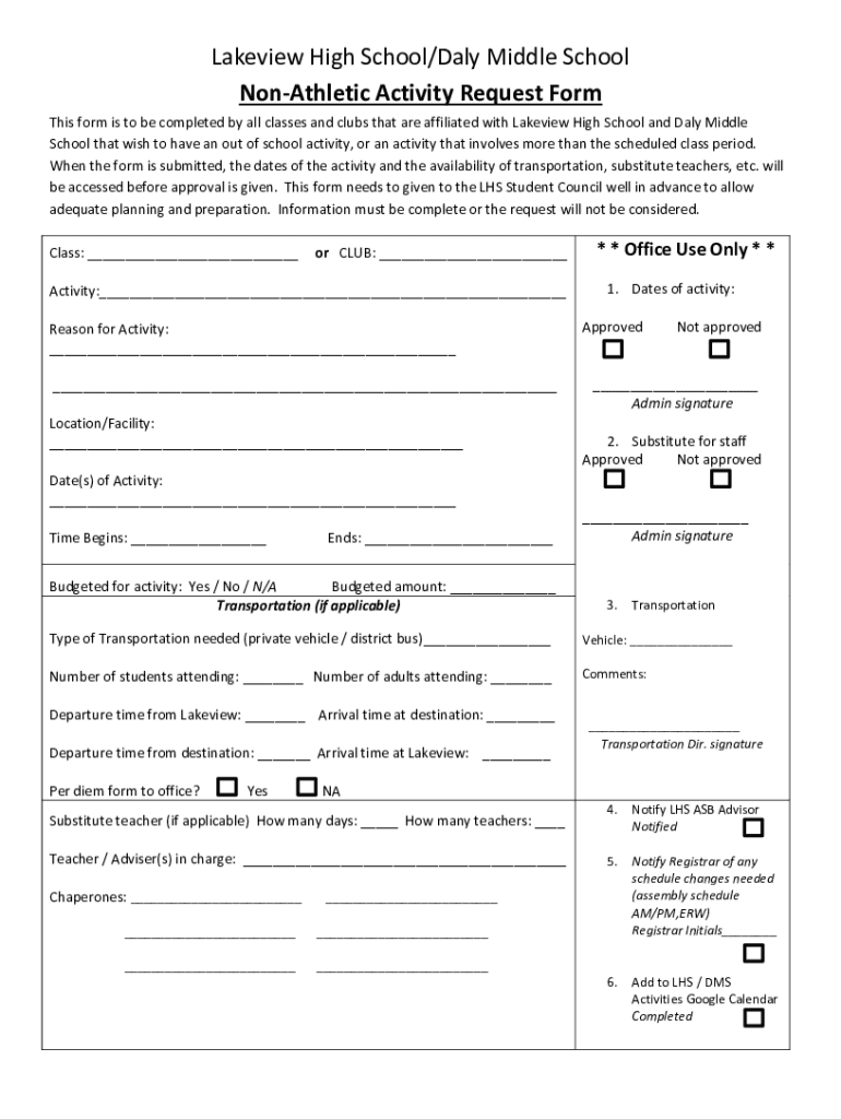 Lake view High School/Day Middle School Nonathletic Activity Request Form This form is to be completed by all classes and clubs that are affiliated with Lake view High School and Day Middle School