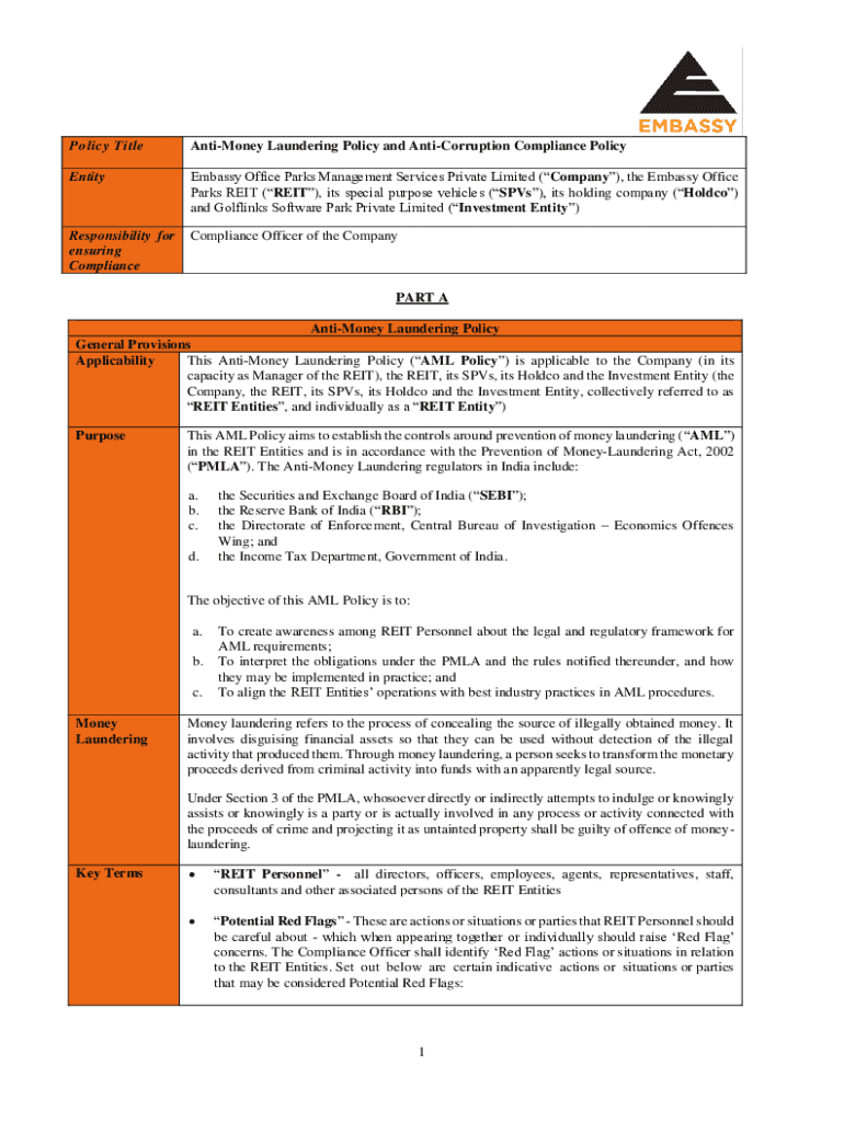 Policy TitleAntiMoney Laundering Policy and Anticorrosion Compliance PolicyEntityEmbassy Office Parks Management Services Private Limited (Company), the Embassy Office Parks REIT (REIT), its special