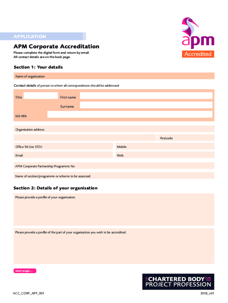 APPLICATION APM Corporate Accreditation Please complete the digital form and return by email. All contact details are on the back page. Section 1: Your details Name of organisationContact details