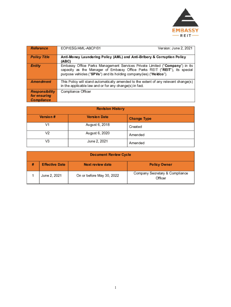Reference/ESG/AMLA BCP/01Policy TitleAntiMoney Laundering Policy (AML) and AntiBribery & Corruption Policy
