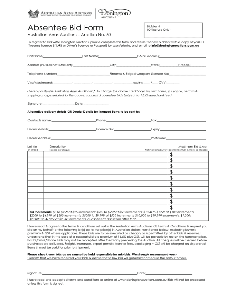 Absentee Bid Forbidden # (Office Use Only)Australian Arms Auctions Auction No. 60 To register to bid with Covington Auctions, please complete this form and return, for new bidders; with a copy of