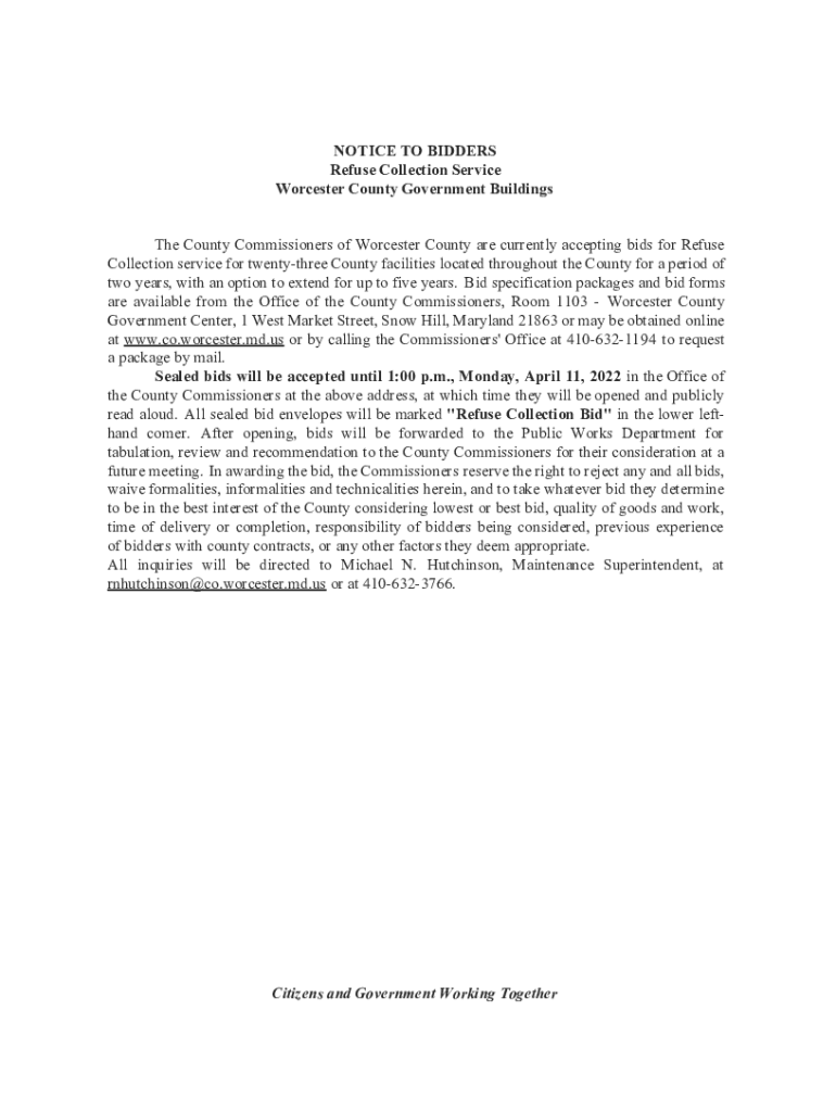 NOTICE TO BIDDERS Refuse Collection Service Worcester County Government Buildings The County Commissioners of Worcester County are currently accepting bids for Refuse Collection service for twenty-three
