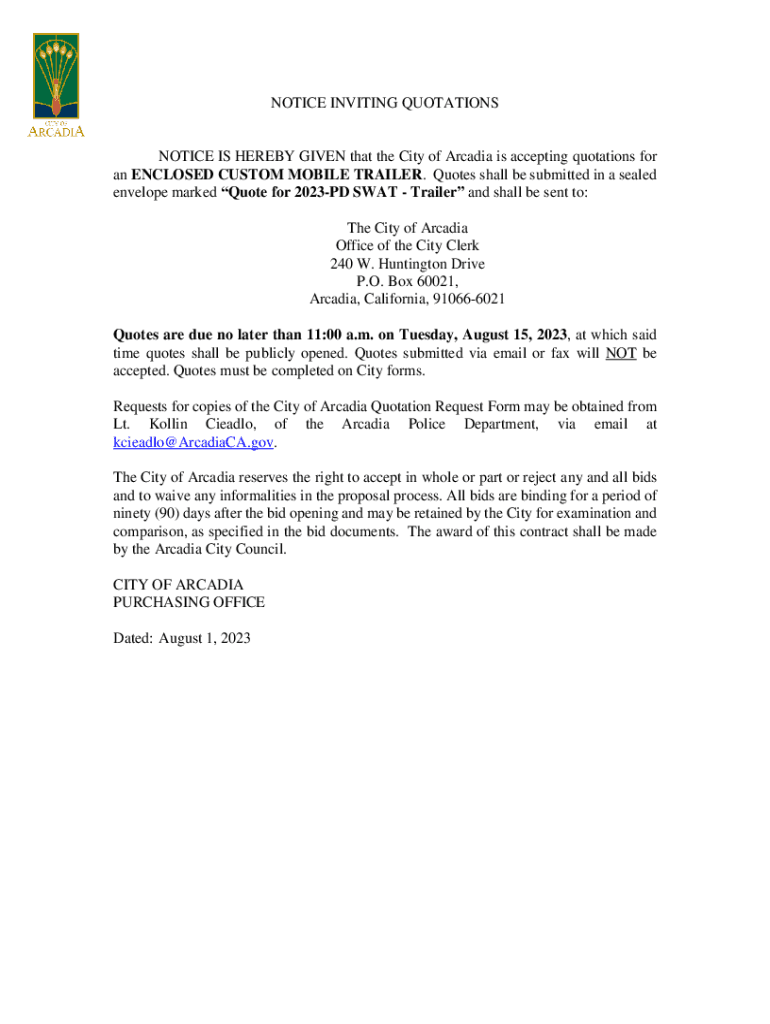 NOTICE INVITING QUOTATIONSNOTICE IS HEREBY GIVEN that the City of Arcadia is accepting quotations for an ENCLOSED CUSTOM MOBILE TRAILER. Quotes shall be submitted in a sealed envelope marked Quote