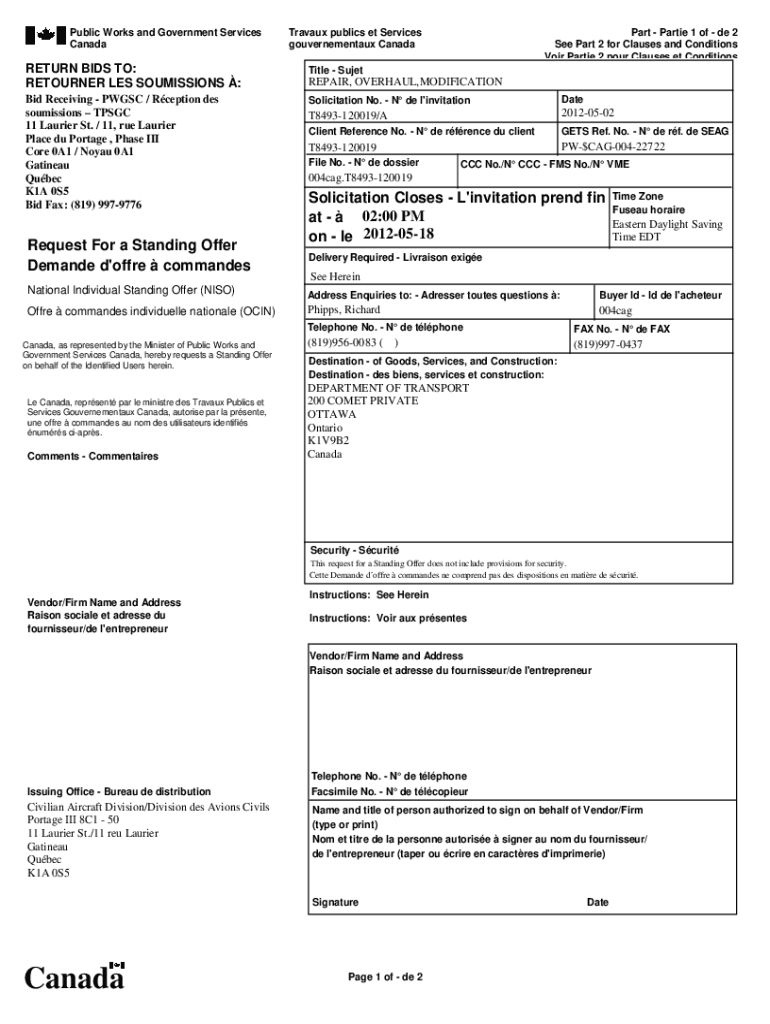 Public Works and Government Services CanadaTravaux public set Services gouvernementaux Canada 1 1Part Parties 1 of DE 2 See Part 2 for Clauses and Conditions Void Parties 2 pour Clauses et ConditionsRETURN